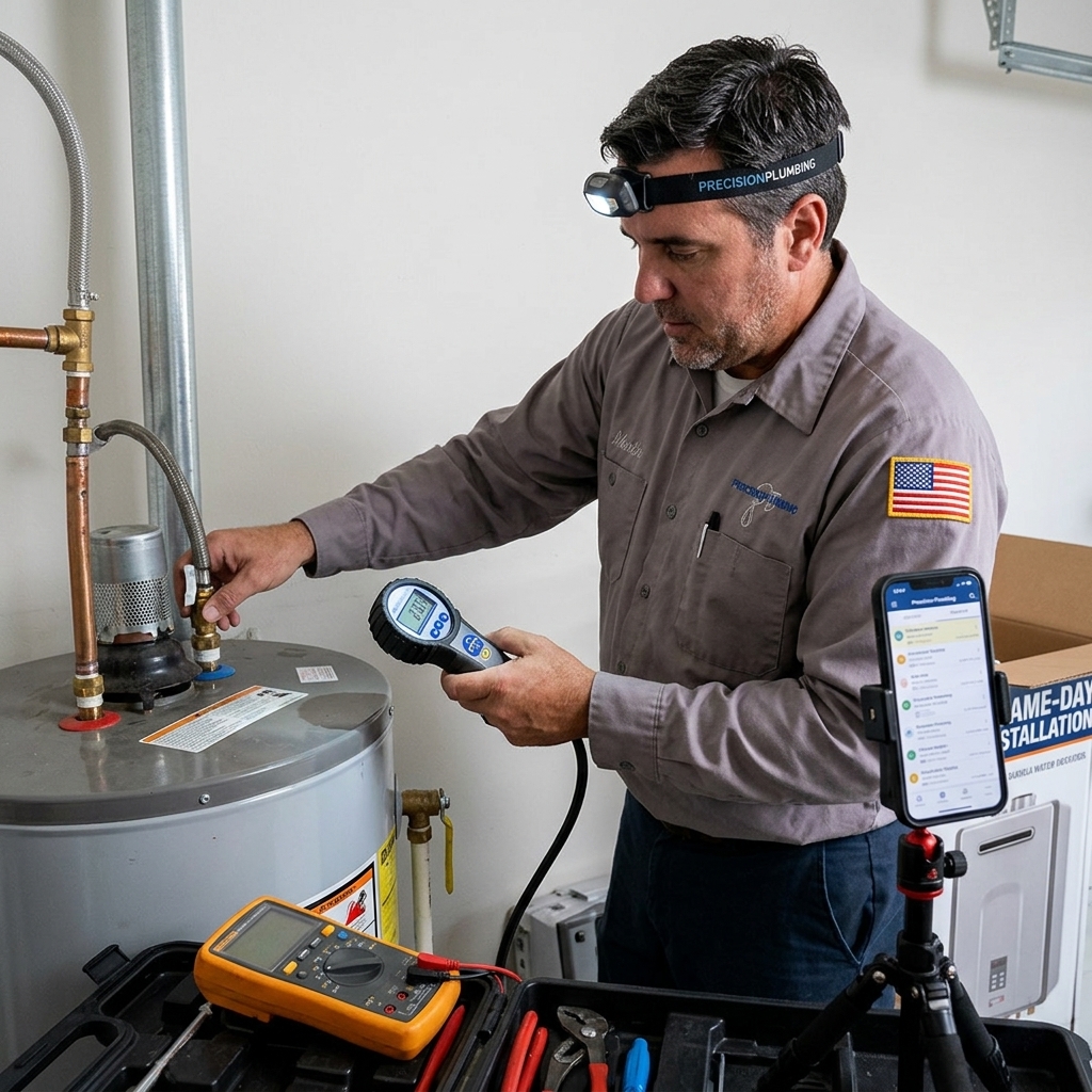 We handle water heater emergencies with same-day response whenever possible. Our technicians can repair many issues on the spot, such as fixing a faulty thermostat or replacing a heating element. If repair isn’t practical, we can often install a replacement unit the same day, whether you prefer a traditional tank water heater or an energy-efficient tankless model.